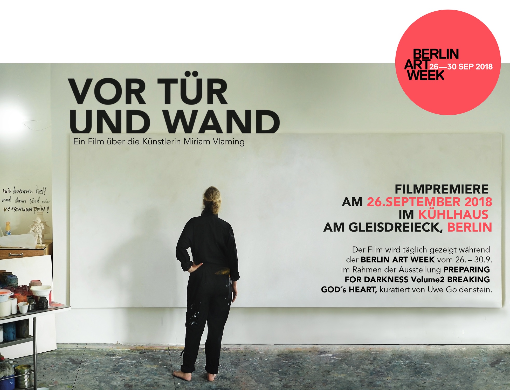 | | FILMPREMIERE: VOR TÜR UND WAND, Berlin KÜHLHAUS BERLIN 26. September 2018, 18:00 Uhr Der von Manuel Dorn produzierte Dokumentarfilm über das Leben und Werk von Miriam Vlaming VOR TÜR UND WAND, 2018 (ca. 45min) wird während der BERLIN ART WEEK (26. September - 30. September 2018) täglich im Kühlhaus gezeigt. Der Film enthält u.a. Interviews von Susanne Altmann (Korrespondentin art– Das Kunstmagazin), Dr. Dr. Thomas Rusche (SØR Rusche Sammlung), Arno Stein (Direktor des Museums Franz Gertsch) und Dr. Alfred Weidinger (Direktor des Museums der Bildenden Künste Leipzig). BesucherInnen haben während der Laufzeit der Ausstellung die Möglichkeit, den Film in den Ausstellungsräumen zu sehen. Regie: Manuel Dorn