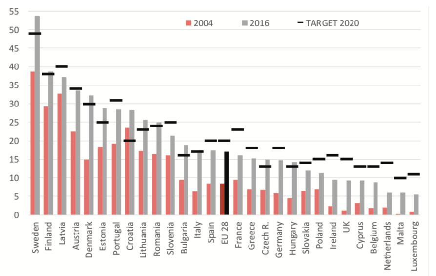 La nuova direttiva rinnovabili UE A pag. 27 del numero di Giugno della Newsletter edita dal Gestore del Mercato Elettrico troviamo un interessante approfondimento: la Direttiva che fissa gli obiettivi in termini di penetrazione e promozione delle fonti energetiche rinnovabili, pubblicata nella sua prima versione nel 2009 - che aveva definito un obiettivo di penetrazione a livello europeo del 20% sul consumo finale, con una ripartizione dello sforzo tra i singoli paesi - è stato uno dei più rilevanti tra gli interventi in tema di ambiente e energia della Commissione Europea.Tutti i paesi hanno fatto notevoli passi avanti pur se con modalità di promozione molto differenziate. Al 2016 undici paesi (tra cui l’Italia) hanno già raggiunto l’obiettivo, la maggioranza si trova su una traiettoria di allineamento entro il 2020, mentre solo alcuni sembrano avviati al mancato raggiungimento, tra cui alcuni paesi dell’est ma anche UK, Irlanda e Francia