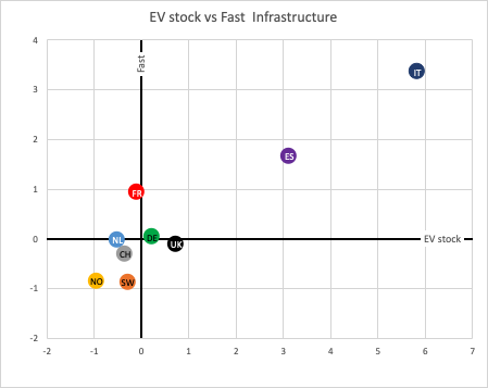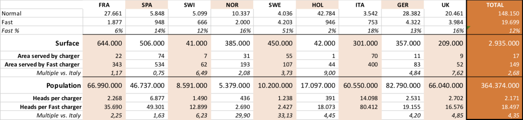 Rete di ricarica: Italia vs. Europa (parte II) Abbiamo scritto ieri della situazione della infrastruttura di ricarica per veicoli elettrici in sette paesi europei. Oggi studiamo questi dati (prendendo in considerazione i soli dati EAFO, più completi) per capire quale sia la strategia vincente per far decollare la Mobilità Elettrica. I due parametri presi in considerazione sono le densità di caricatori “Normali” (fino a 22 kW) e “Fast” (da 50 kW in su) rispetto alla popolazione di ciascun paese. Già ieri abbiamo visto che la media dei sette paesi (la chiameremo per brevità “europea”, anche se non lo è) vale: - 1 caricatore Normale ogni 2.459 abitanti - 1 caricatore Fast ogni 18.497 abitanti