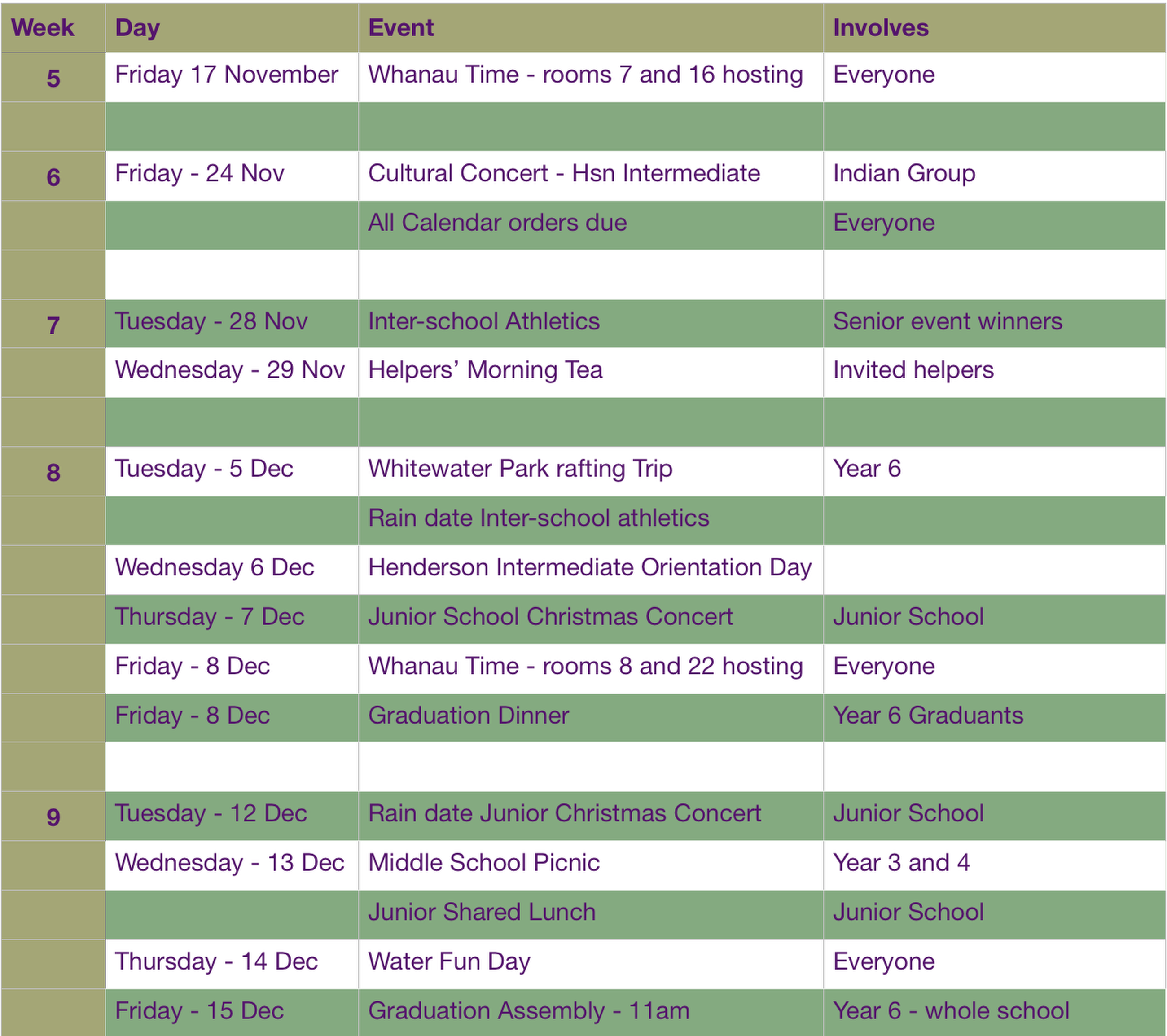 | | Full School Assembly - Whanau Time Whanau Time is every second Friday in our hall, starting at 9:45 am sharp. Everyone is warmly welcomed to join us for these special WHS family occasions. Next Whanau Time - Friday 17 November. Rooms 7 and 16 hosting. Our last Whanau Time for the year will be on Friday December 8 - rooms 8 and 22 hosting. | | |