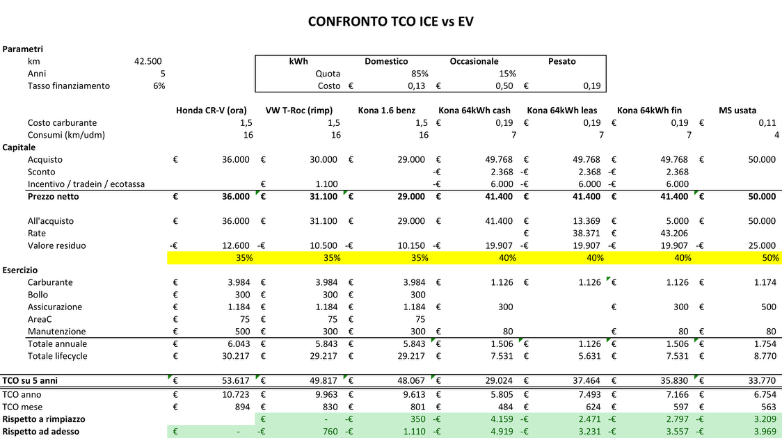 Fatemi i conti in tasca: perché mi conviene l'elettrica Un po’ di tempo fa provai a fare un p’ di conti sulla convenienza di un’auto elettrica in alcuni scenari di utilizzo. Oggi, essendo la mia venerabile (e affidabilissima) Honda CR-V arrivata a 240.000 kilometri in poco più di 5 anni, devo prendere in considerazione la sua sostituzione – in realtà si tratterà di un affiancamento, dato che l’auto da sostituire è una piccola Ford Fiesta Euro4 poco meno kilometrata.