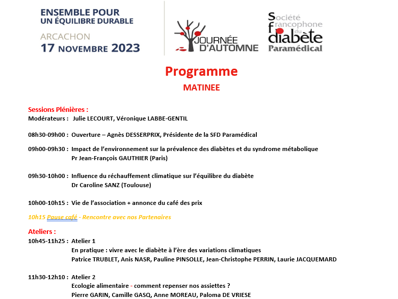 Nous vous donnons rendez-vous le vendredi 17 novembre pour la Journée d’Automne qui aura lieu à Arcachon. Un programme innovant cette année en lien avec la préservation d’un environnement favorable pour les personnes vivant avec un diabète.