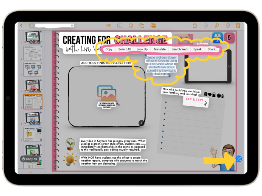| | | | | Live Video Green Screen We have mentioned this one before, but it is just too good not to highlight again 🙌🏻 Using the Live Video feature in Keynote, you can create green screen projects - without needing paid apps or even a green screen! For a full ‘How To Video’ of this project - visit this blog post. | | | |