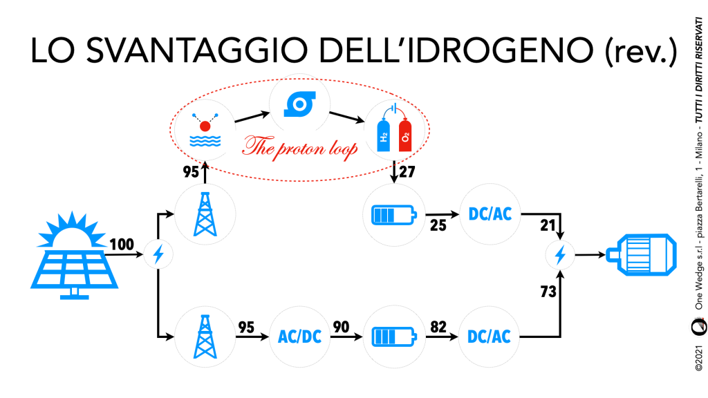 Lo svantaggio dell’idrogeno (rivisitato) Qualche giorno fa ho pubblicato un articolo che parlava dello svantaggio in efficienza lamentato dal ciclo dell’H2. Un paio di amici mi hanno fatto notare alcune imprecisioni che meritano una correzione: 1) molti elettrolizzatori NON sono costruiti nelle immediate vicinanze di un campo fotovoltaico o eolico, e dunque è necessario tenere conto anche nel loro caso di perdite di trasporto. 2) lo stadio finale di un’auto FCEV ha una batteria, perché in caso contrario la potenza verrebbe erogata troppo lentamente.