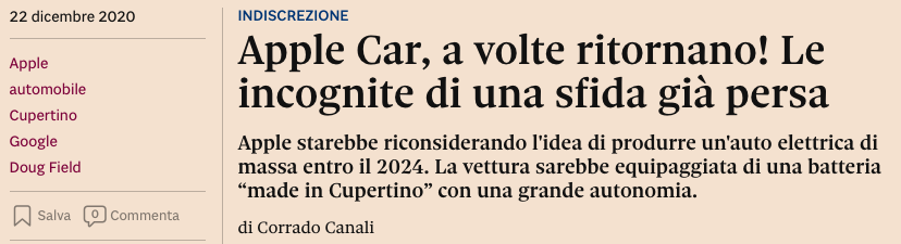 Ci credo alla Apple Car? Sono almeno un paio d’anni che uno spettro si aggira per il mondo, il classico “rumor which refuses to die”: sta arrivando la Apple Car! Relegato per mesi sulle pagine di oscuri blog e magazine online per appassionati, oggi emerge nientepopodimenoché sulle pagine salmonate del Sole 24 Ore. Ma perché mai Apple dovrebbe fare una cosa del genere? Beh, per essere sinceri, qualche ragione, e non proprio banale, ci sarebbe: