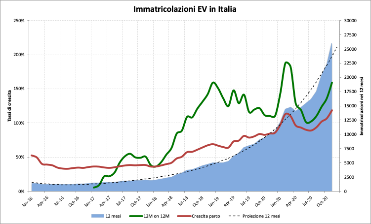 Immatricolazioni Novembre 2020 In un altro mese pesante per il mercato dell’auto che perde oltre l’8% rispetto all’anno scorso soprattutto per colpa di benzina (-37%), diesel (-28%) e metano (-31%) solo il comparto elettrificato offre qualche speranza di ripresa, quasi quadruplicando le vendite rispetto all’anno scorso, soprattutto grazie ad un grandissimo exploit delle elettriche pure che immatricolano 4.810 vetture, il miglior risultato di sempre. Per mettere i numeri in prospettiva, nell’intero anno 2018 furono immatricolate 5.010 BEV !