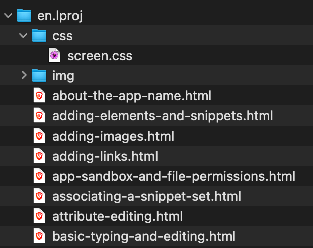 Writing the Help PagesEach Help page is just a simple, standard .html file that explains some particular topic. I keep these .html files all together inside a single Help folder in TypeMetal’s source tree, wrapped in an en.lproj subfolder that indicates English language localization. This sets up the basic internal structure expected for a macOS .help bundle, as we’ll see below in “Building the .help Bundle.” Alongside the .html files are a couple of subfolders, that hold the images they incorporate (in img) and the CSS stylesheet that I created to style TypeMetal’s Help (in css): | | | |