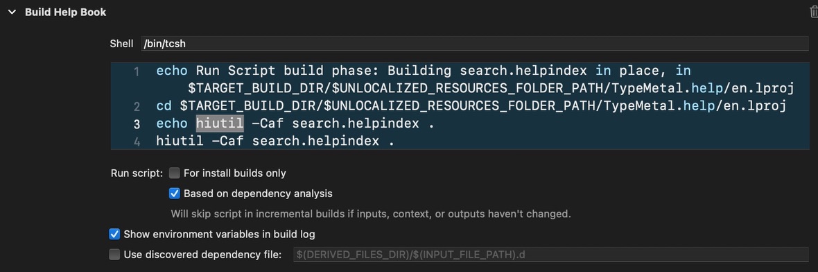 | | This injects a copy of the nearly complete TypeMetal.help bundle into TypeMetal.app’s Resources subdirectory. The final step is to index the .help bundle, which I’ve found it easiest to do in its build destination. To index the .help bundle in-place, I use a “Run Script” build phase in TypeMetal’s Xcode project: | | | |