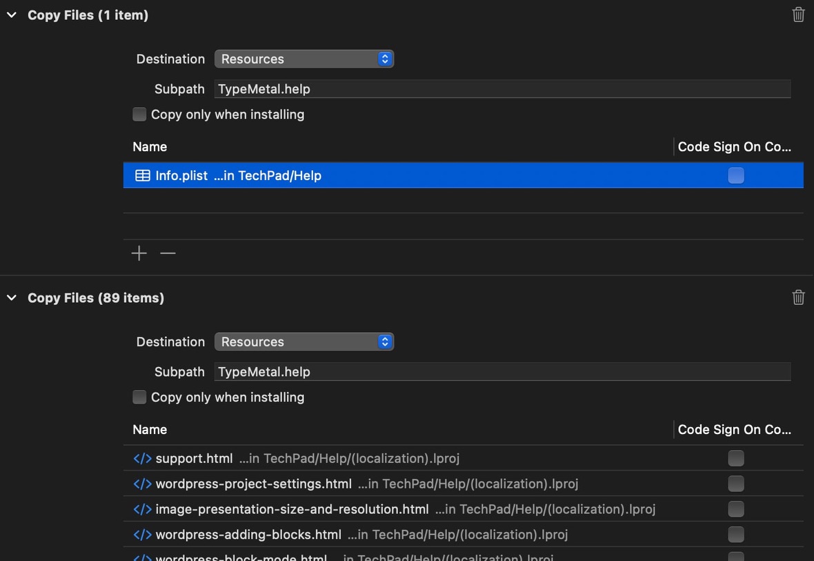 | | I use a series of Build Phases in TypeMetal’s Xcode project to make embedding and indexing of the .help bundle an automatic part of building TypeMetal. The file copying is easily accomplished using a series of standard “Copy Files” build phases — one for the Info.plist, and one for the remaining files: | | | |