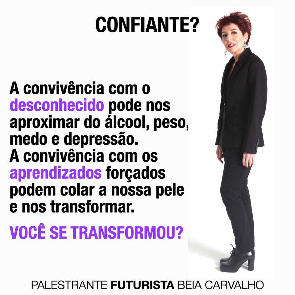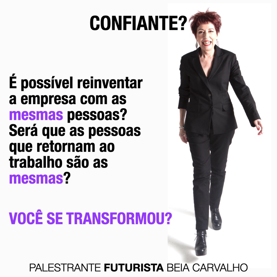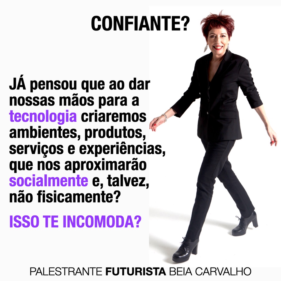 | | Bio da Beia CarvalhoViajante inveterada, amante de vinho e papos sem fim. Há 12 anos, a Futurista qualifica e inspira o mercado com conteúdos que movem equipes, em direção às infinitas possibilidades do futuro. Primeira figura feminina a falar de inovação e futuro com leveza e humor, para diversos setores. É influenciadora da empresa de tecnologia SAP, palestrante TEDx, ligada ao London Futurists. Eleita Personalidade RH 2019, Prêmio Excelência Mulher e premiada no Festival de Cannes, com 4 leões. Publicitária pela ECA-USP. Foi sócia e vice-presidente de planejamento de 3 agências de publicidade.