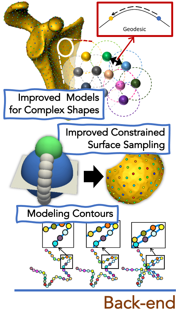 | | | Improved Models, Contours Support & More ...Improved shape models for convoluted structures: Geodesic distance-based repulsion is now supported for mesh domains. This improves results on structures with thin and/or convoluted features at the cost of increased memory and runtime. Refer to the thin_cavity_bean use case for an example. Optimizing shape models on contours: N-dimensional contour domains are now supported in ShapeWorks. Refer to the supershapes_1mode_contour use case for an example. Robust and scalable primitive-based constrained surface sampling: Constraints are now implemented by turning the problem into an unconstrained optimization using the augmented lagrangian inequality formulation. The new implementation supports both cutting planes and spheres. It also supports multiple constraints per domain/shape with different types. Consolidated library for shape statistics: The shapeworks computational library is updated to include refactored code for shape statistics, including functions to read particle files and compute eigenvectors, eigenvalues, and PCA loadings. | |