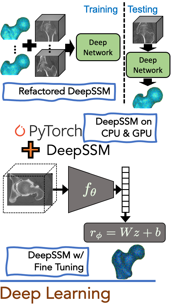 | | Refactors and Improved DeepSSM & More ...Refactored DeepSSM: Defined a config file for DeepSSM parameters that are used in training and testing. This will be helpful for parameter tuning, model comparison, and adding additional functionality and parameters to DeepSSM. DeepSSM with fine-tuning: A fine-tuning option has been added to DeepSSM. This allows the model to learn the mapping between the PCA space to the correspondence point space, improving accuracy. Improved DeepSSM evaluation: DeepSSM evaluation has been adapted to use ShapeWorks mesh warp function and Python binding mesh distance function. DeepSSM on both GPU and CPU: The DeepSSM use case has been adapted to run on both GPU and CPU. It is considerably faster on GPU but no longer exits when running on CPU. | |